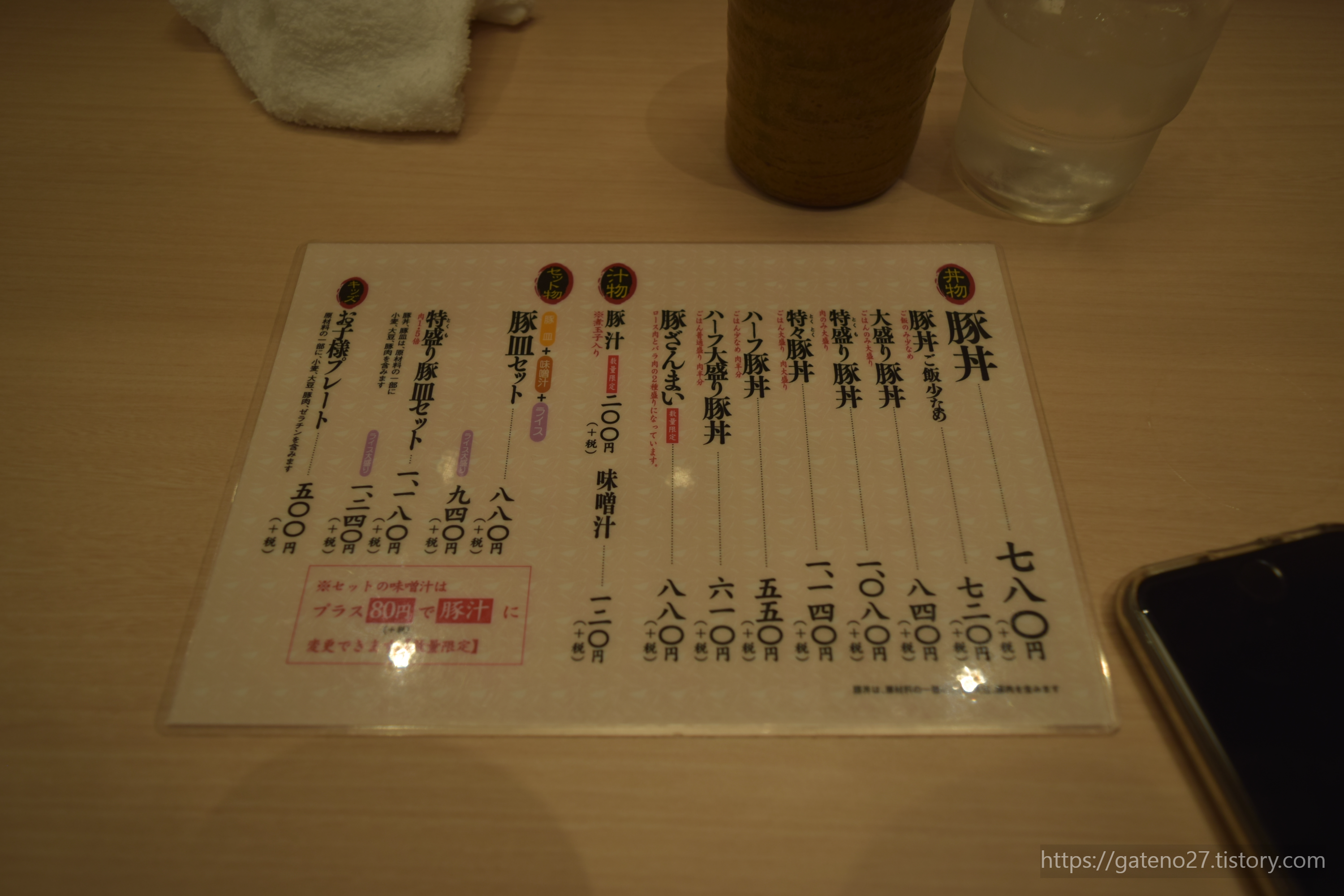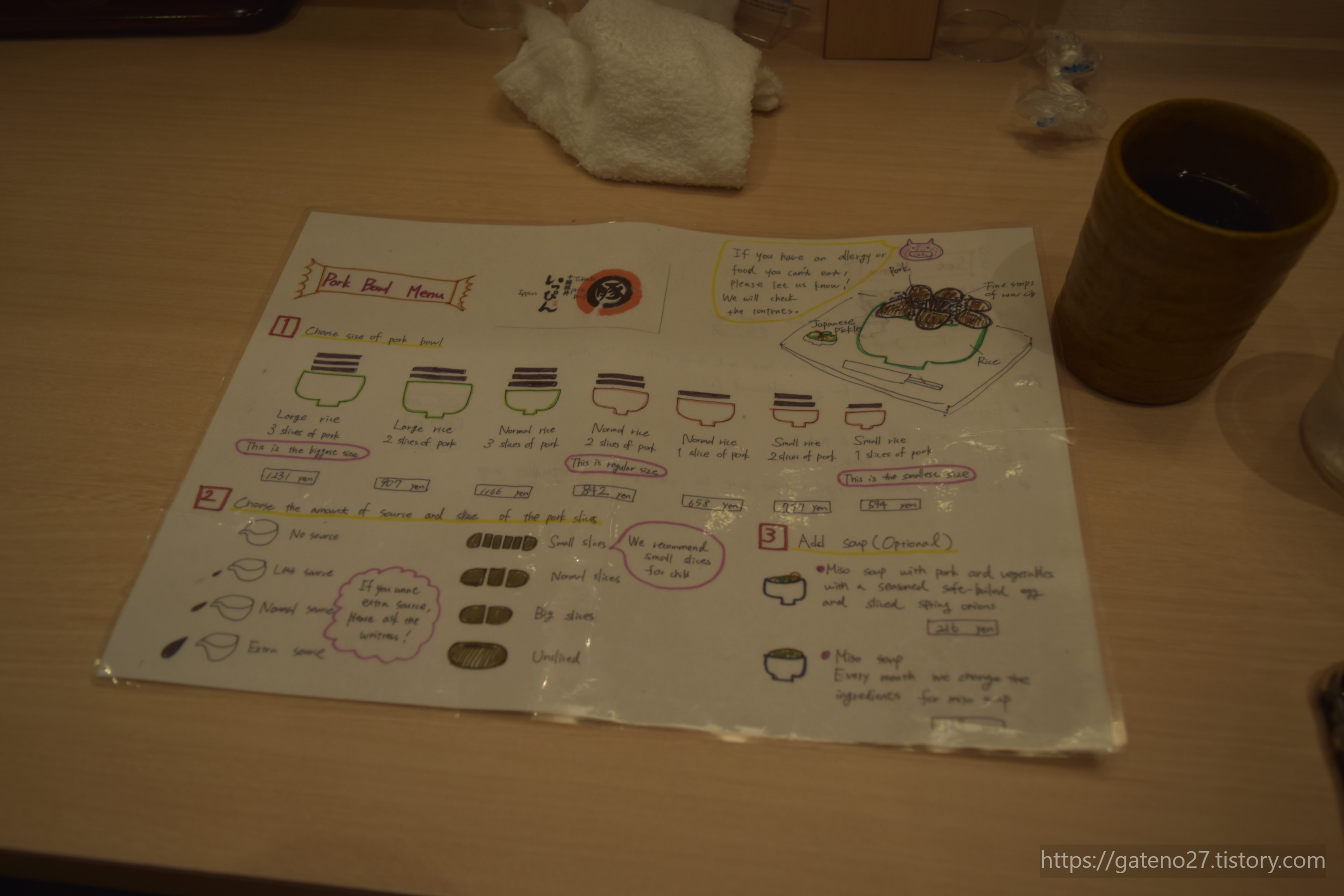 나는 가장 무난해 보이는 부타동 메뉴를 선택. 가장 많이 선택한다는 선택지를 골랐다. 870엔짜리 보통사이즈 부타동을 주문했던 걸로 기억한다. 국은 패스.