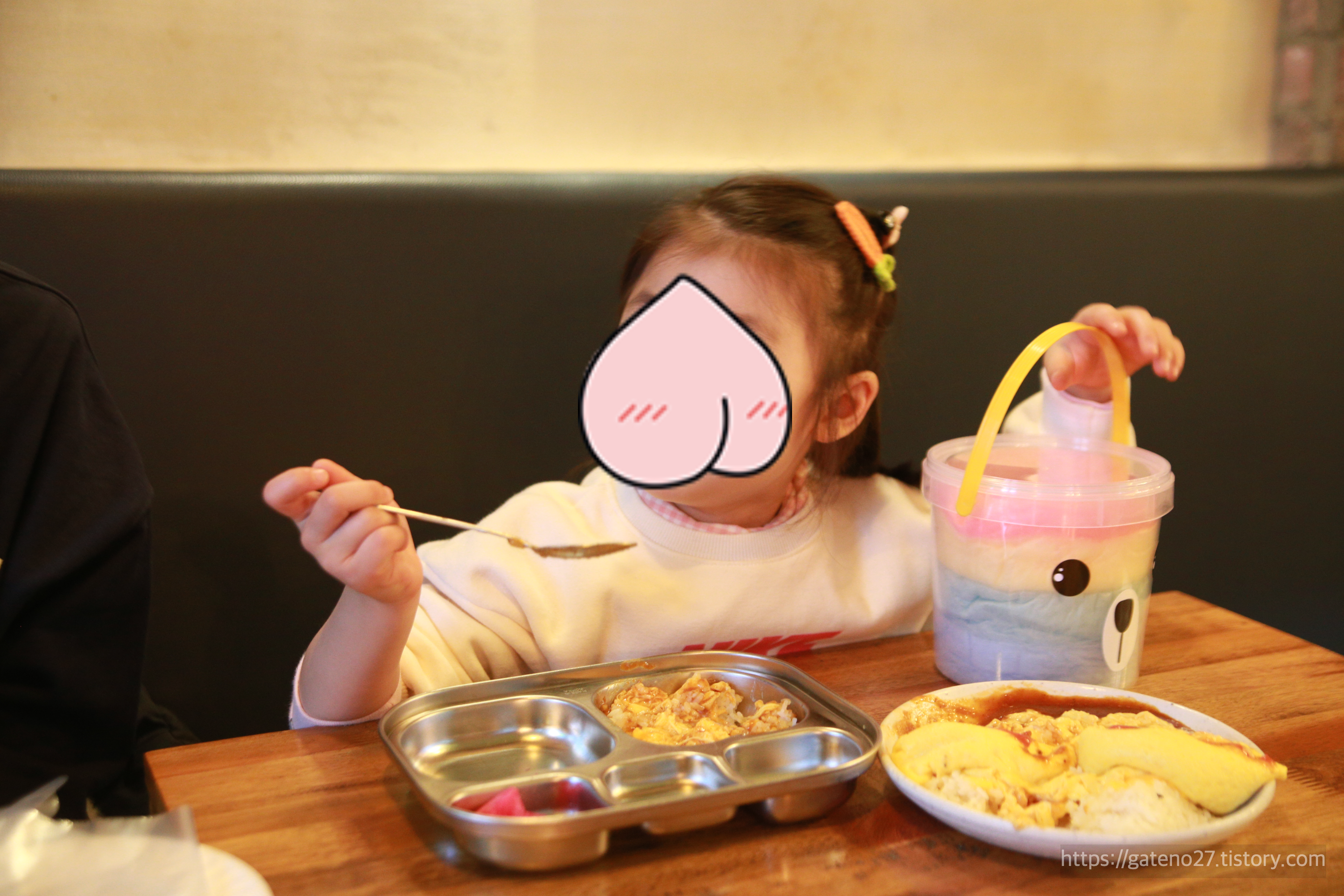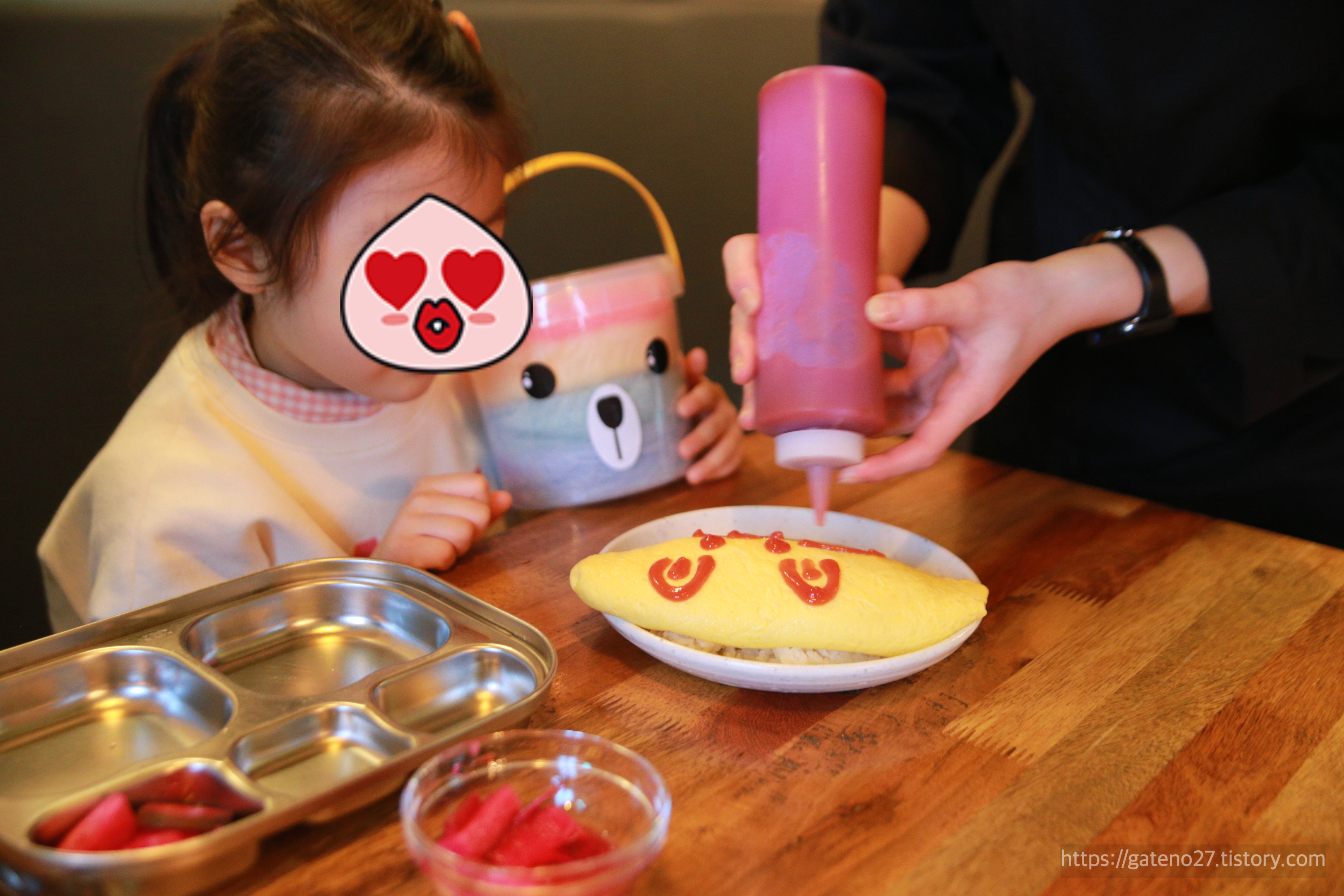 일단 딸아이가 주문한 어린이 오믈렛(성인(?) 메뉴인 흑돼지 오믈렛에서 매운 것 빼고 만듦)을 서빙해 주셨는데, 라떼아트가 아닌 케첩아트를 선보여 주셨다.
