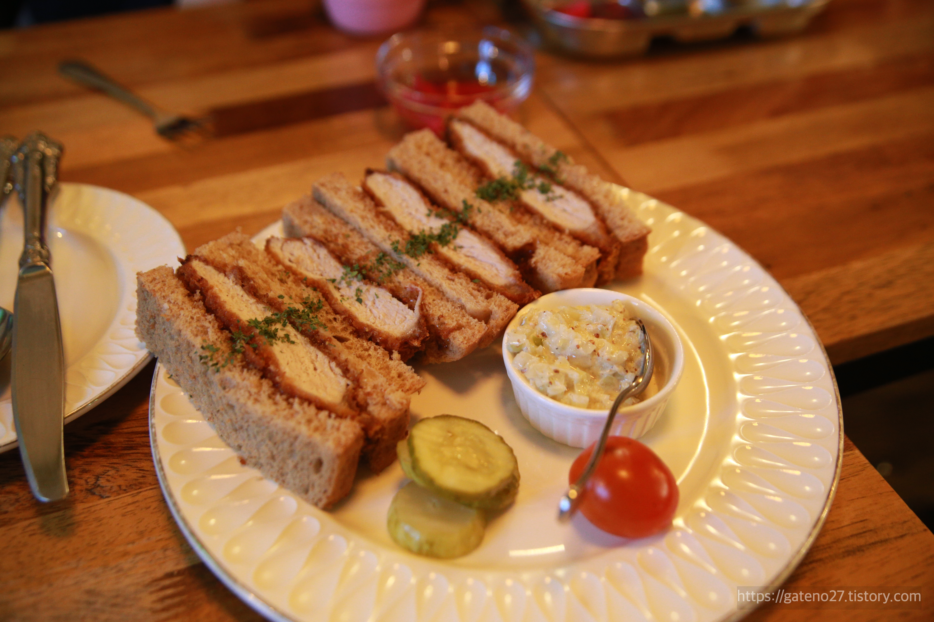 그리고 어른들을 위한 메뉴. 첫 번째는 흑돼지 가츠산도였다. 24시간동안 숙성한 흑돼지 등심을 이용해 만든 일본식 샌드위치다. 돈까스를 식빵에 껴 먹는 느낌인데, 담백한 고기 맛이 참 좋았다. 일단 비주얼부터 합격.