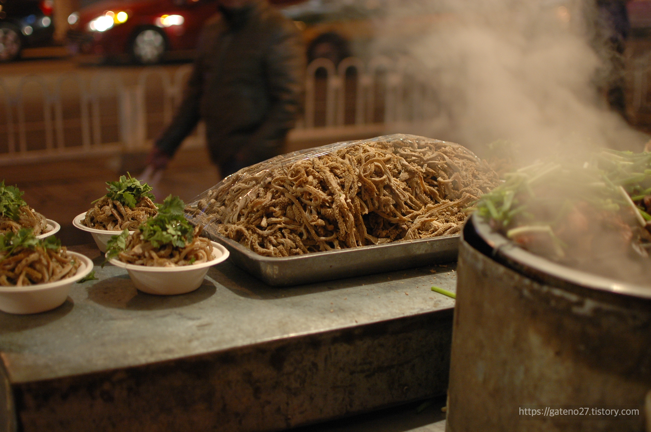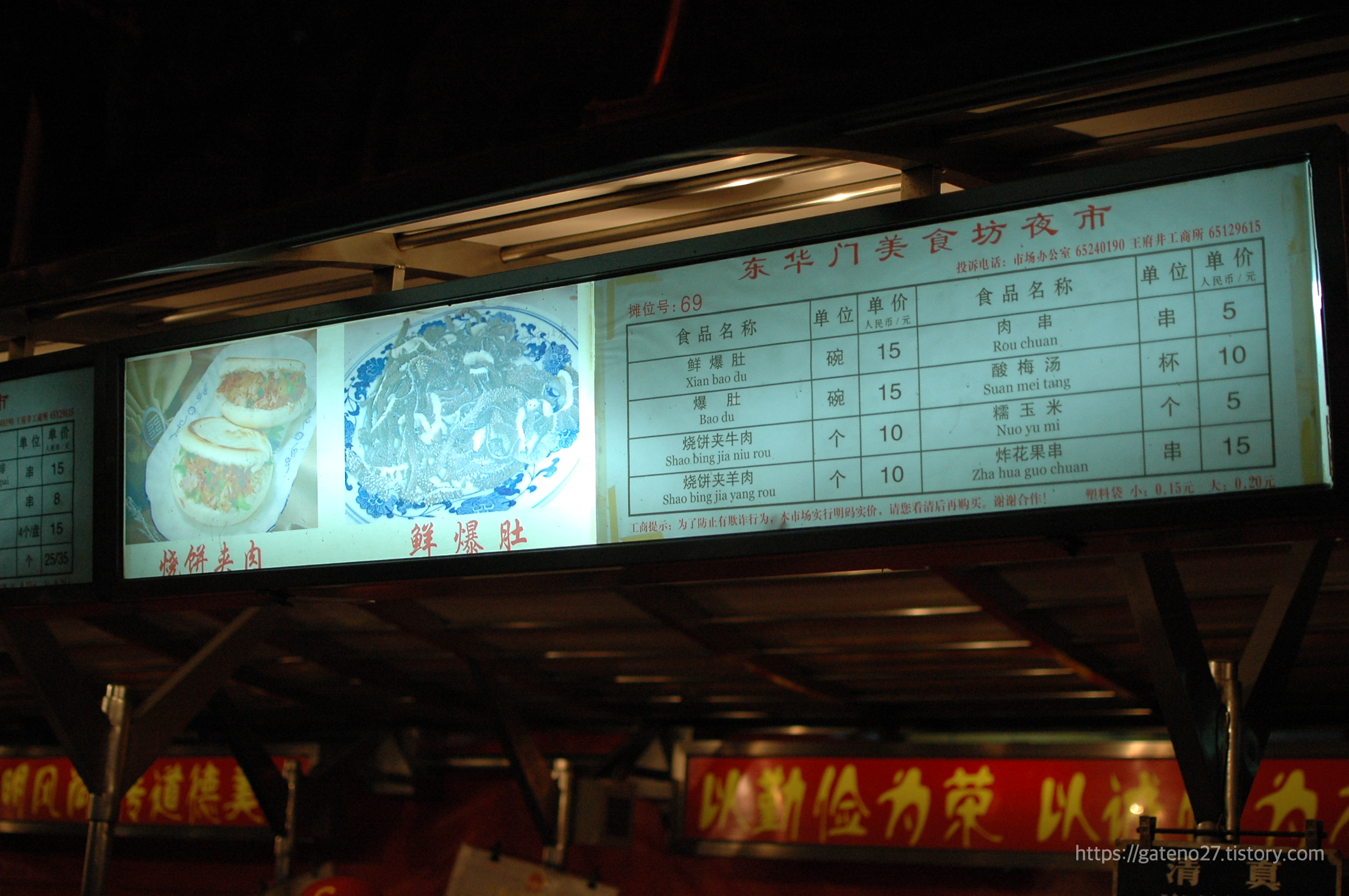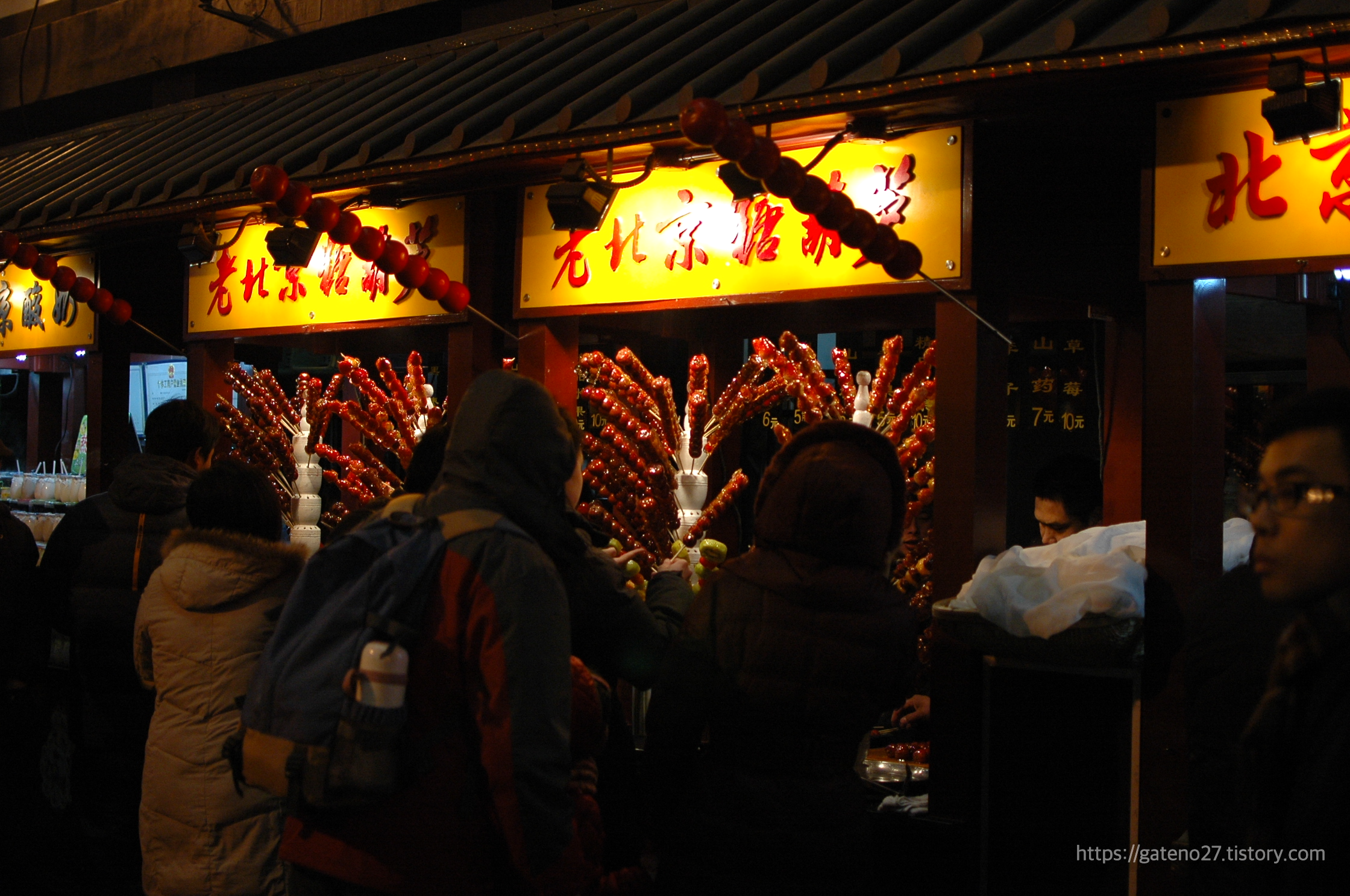 번화한 왕푸징 거리를 잠시 벗어나니, 포장마차가 쭉 각잡고 늘어서 있는 거리가 등장했다. '둥화먼미식야시장'이라는 간판이 붙어 있다. 아, 여기가 말로만 듣던 그곳이구나.