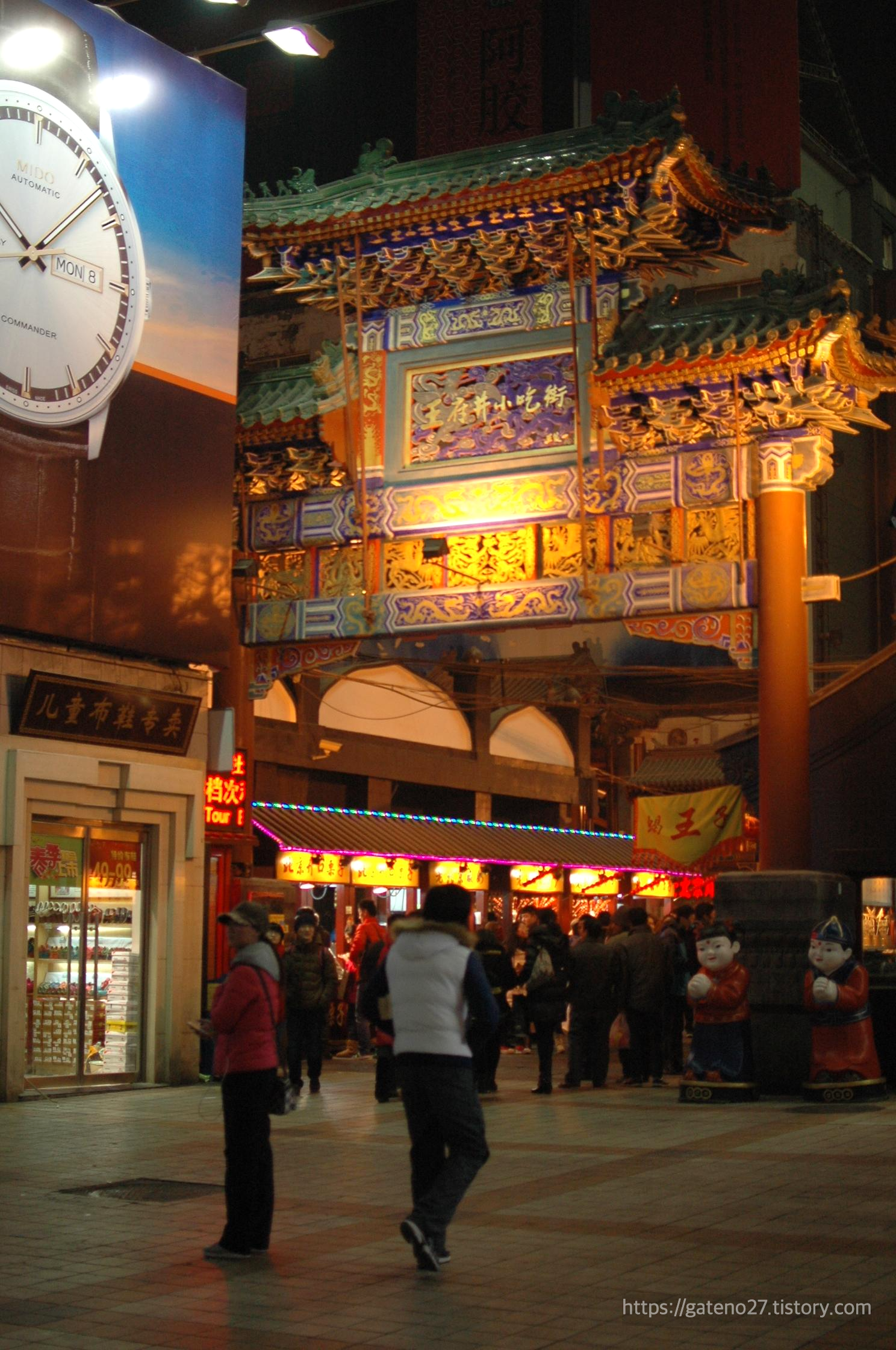 그렇게 놀라운 먹거리를 감상하며 걷다보니 큰 패루가 하나 나왔고, 왕푸징간식거리(王府井小吃街)라는 문구가 패루 위쪽에 적혀 있었다. 이곳에서도 둥화먼예스와 마찬가지로 다양하고(?) 이상한(!) 먹거리들을 팔고 있었다.