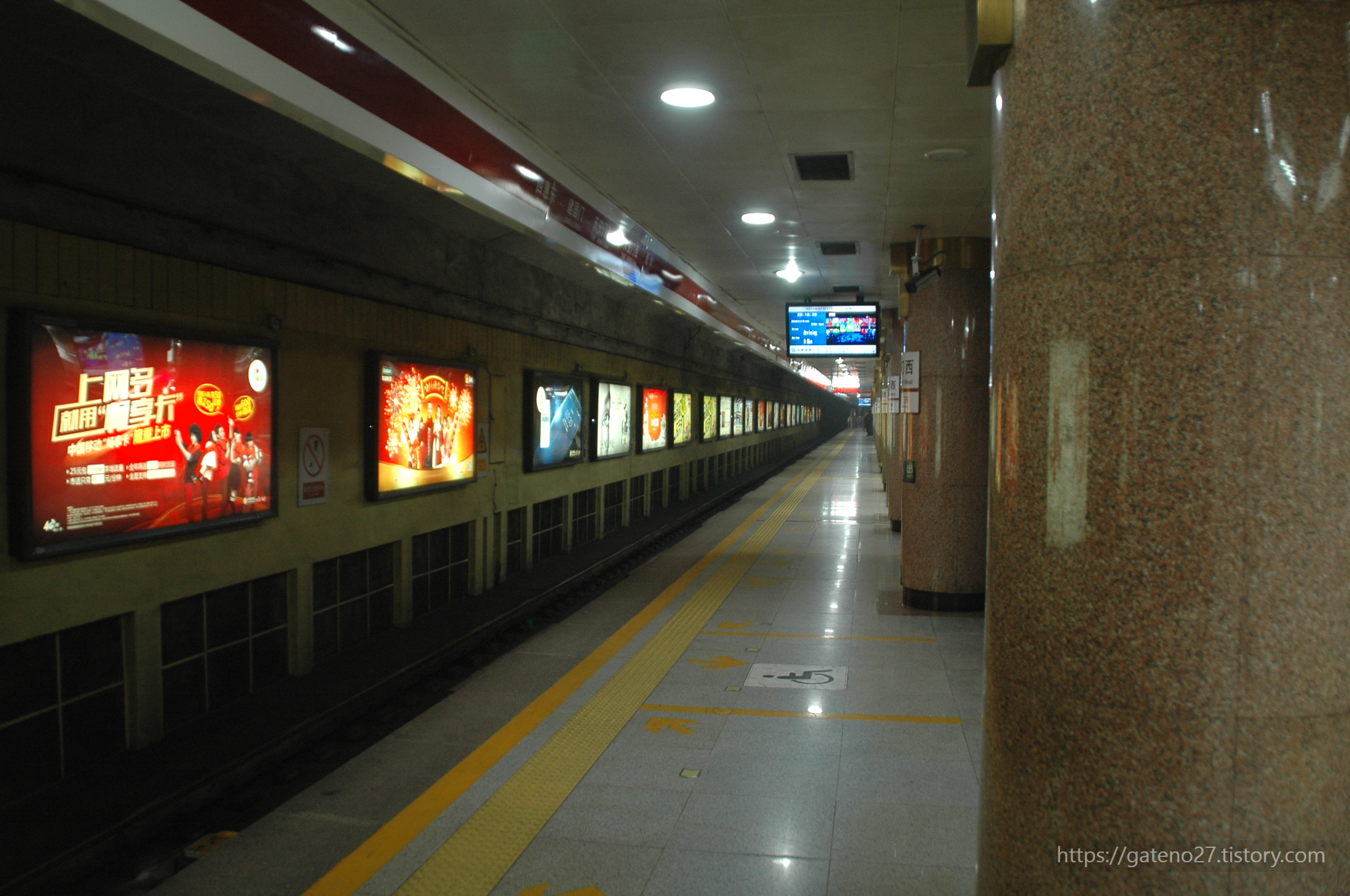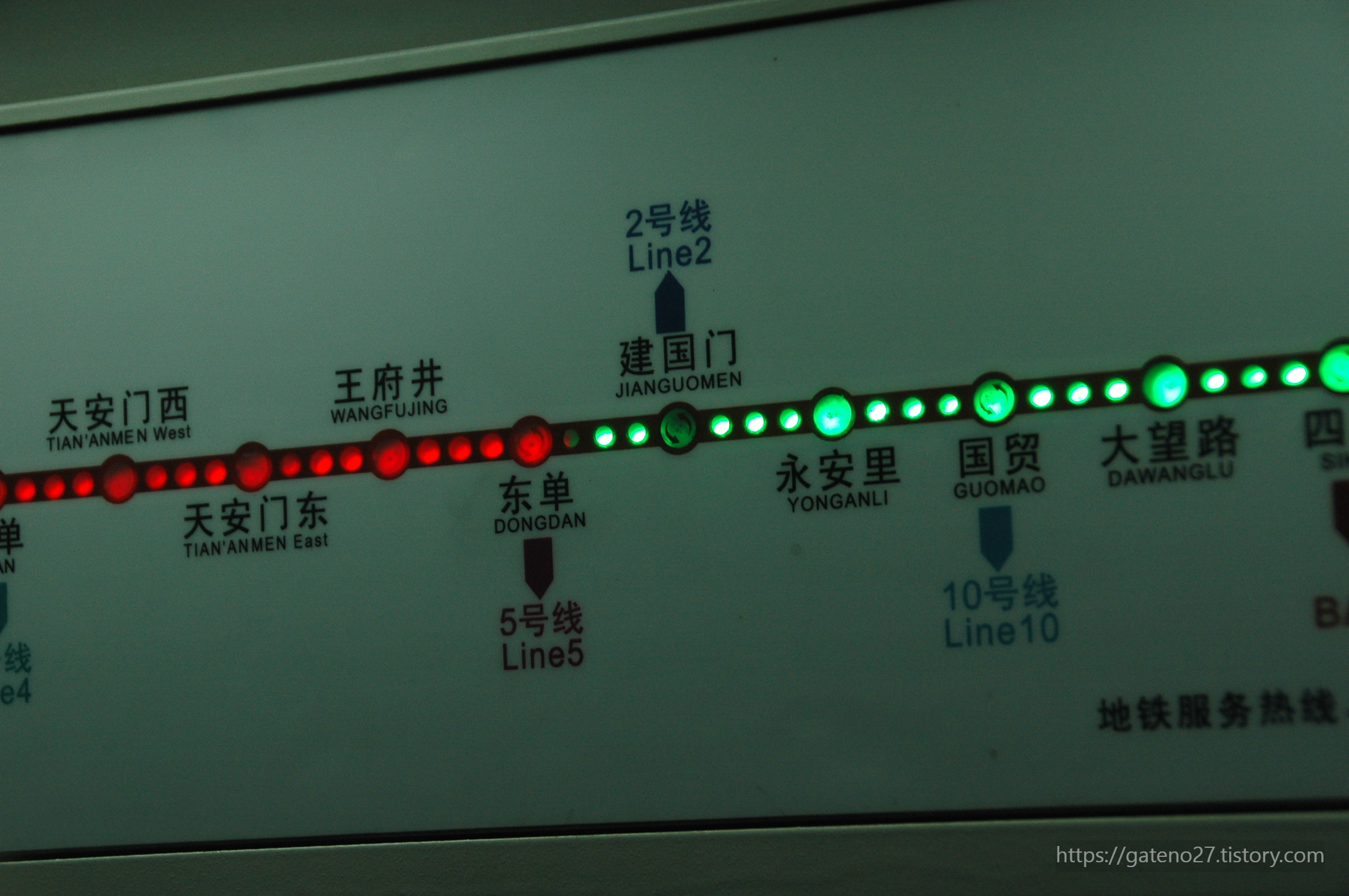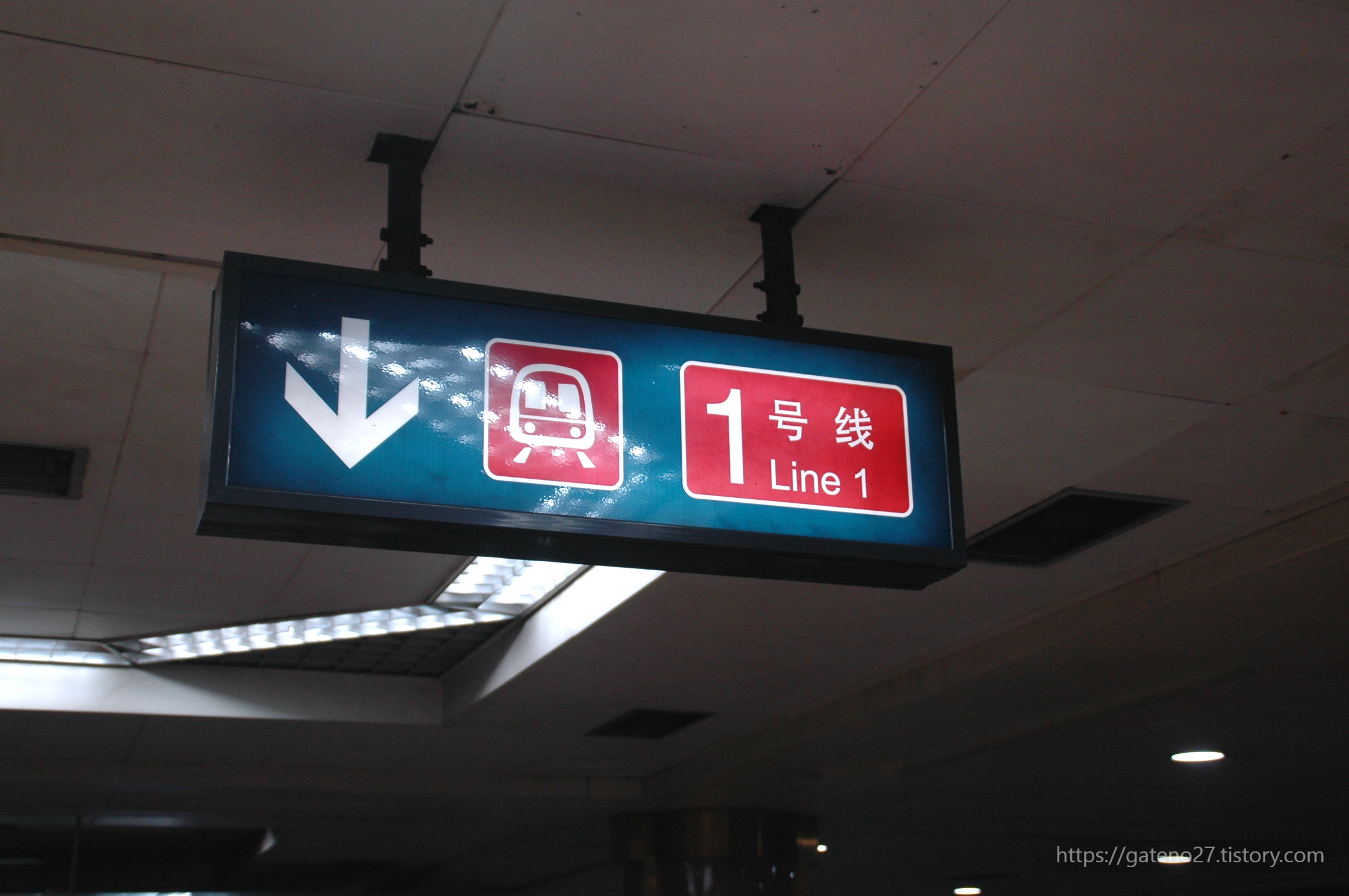 이제 지하철을 타러 내려갔다. 아까 한 번 타 본 경험이 있으니 그리 어렵진 않다. 첫 번째 코스는 이곳 톈안먼시역(天安门西站 / Tiananmen West Station)에서 네 정거장 거리에 있는 젠궈먼역(建国门站 / Jianguomen Station)이다.