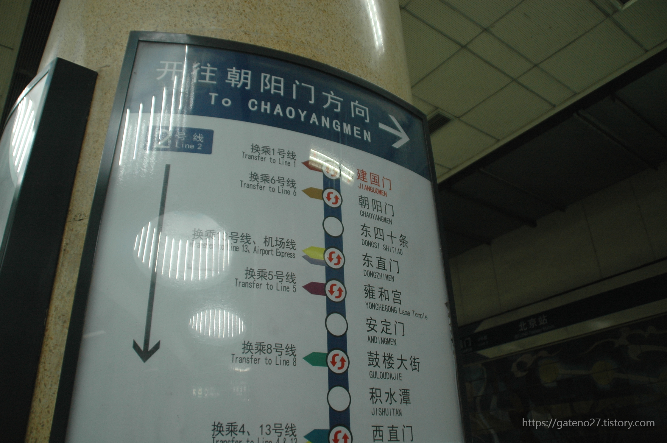 젠궈먼역 도착. 이제 2호선으로 환승 후, 수도공항선(ABC)으로 환승 가능한 둥즈먼역(东直门站 / Dongzhimen Station)으로 갈 차례다.