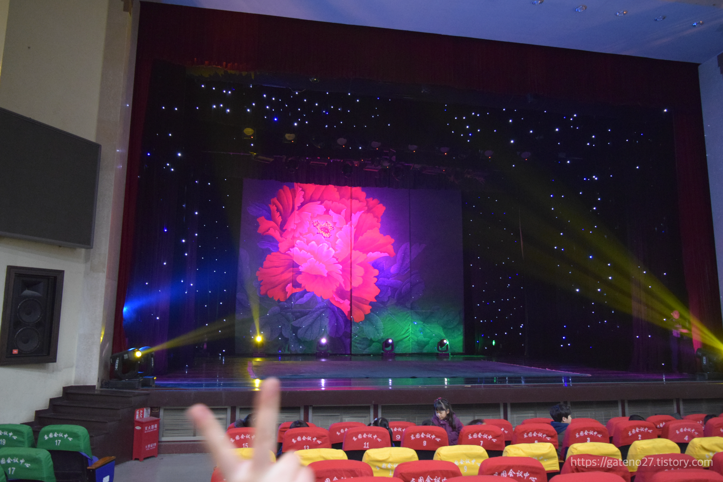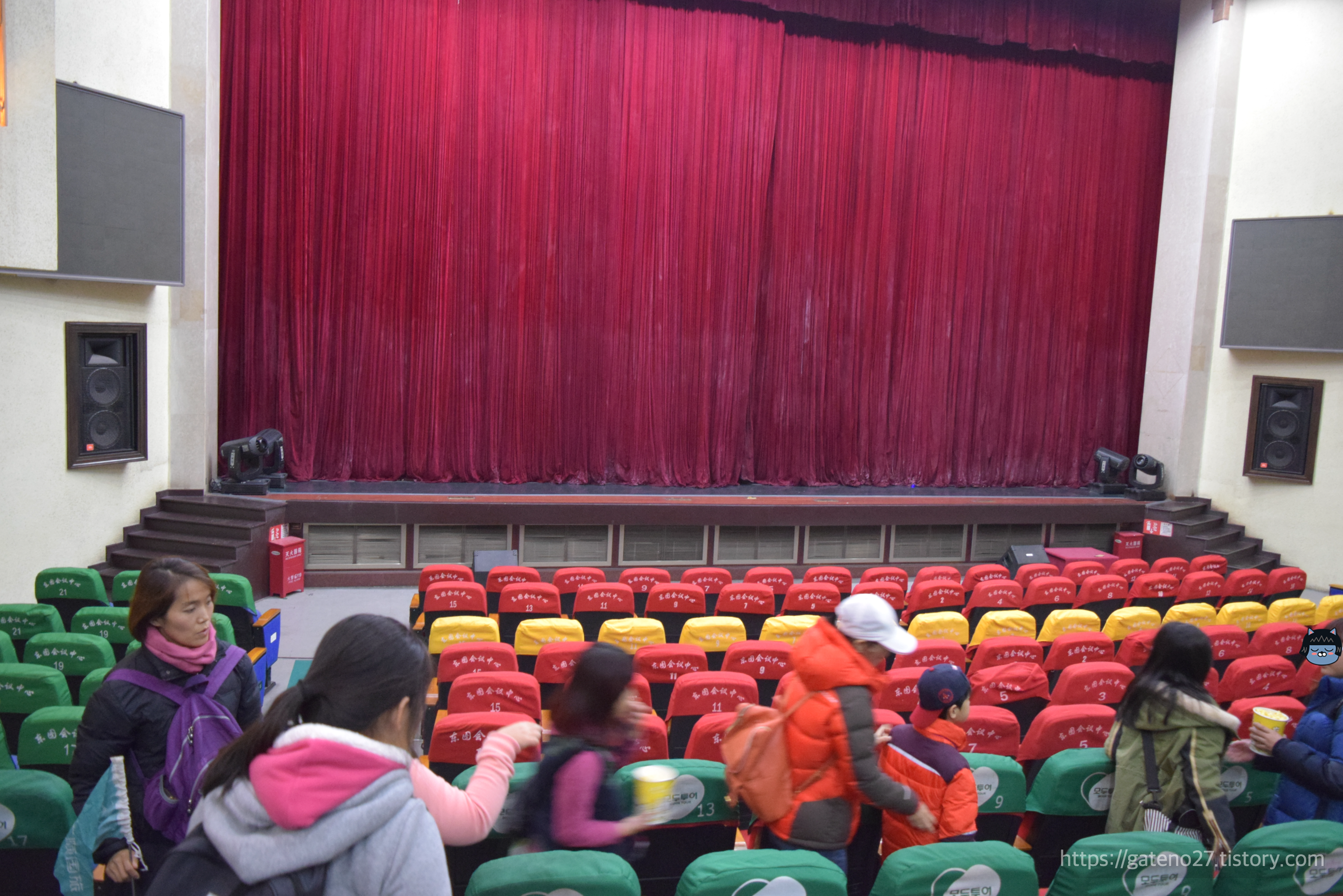 주의사항을 들은 후, 가이드님이 사 주신 팝콘을 하나씩 들고 공연장 안으로 들어갔다. 빨갛고 노랗고 초록색인 시트(신호등🚥?) 사이로 모두투어 로고가 선명하다.
