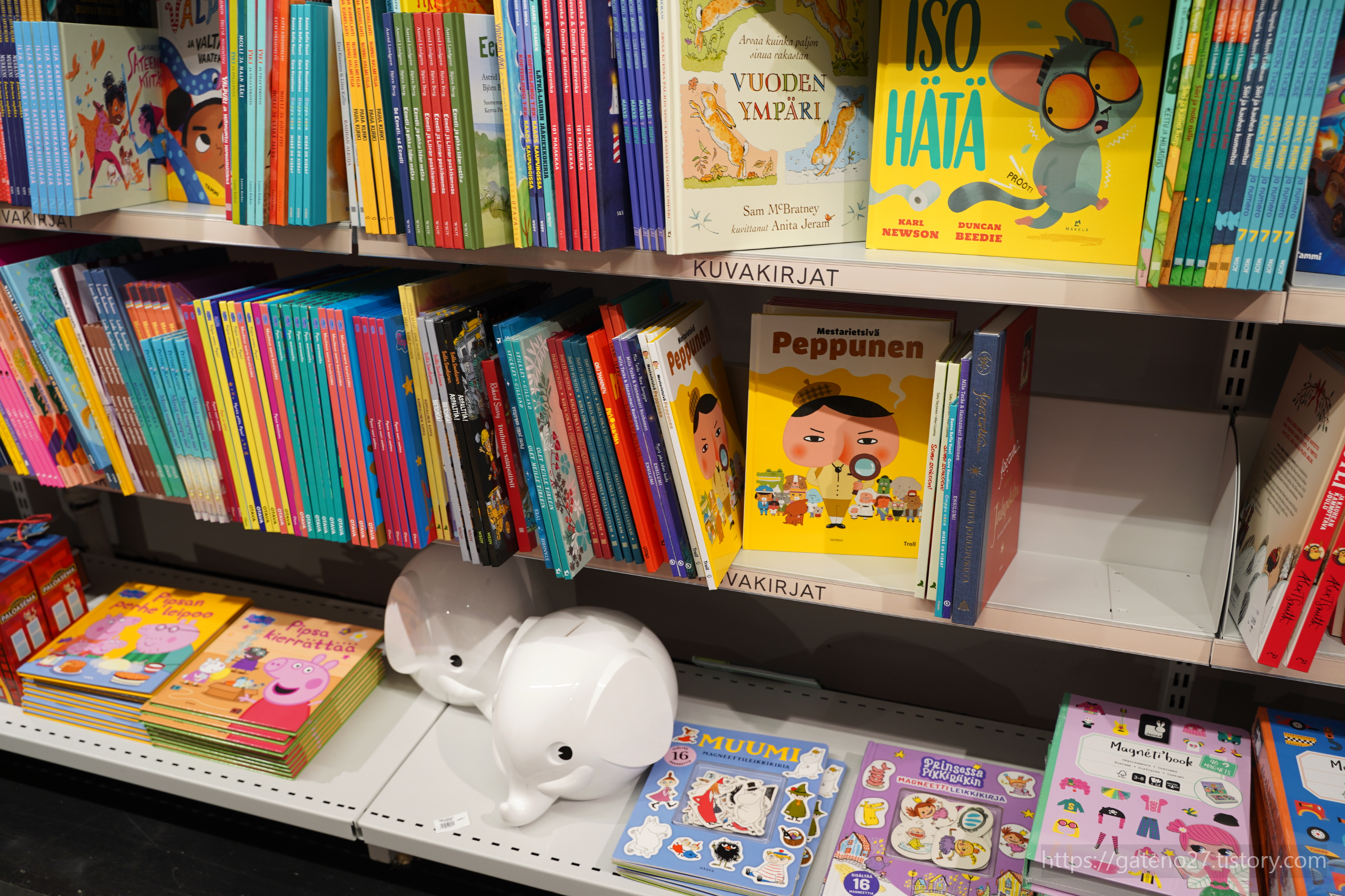 이곳은 헬싱키 시내의 또 다른 수오말라이넨 서점. 동화책과 각종 교재들이 있는 곳을 살펴보았다. 많이 보던 그림들도 보인다. 엉덩이탐정이나 페파피그 같은.