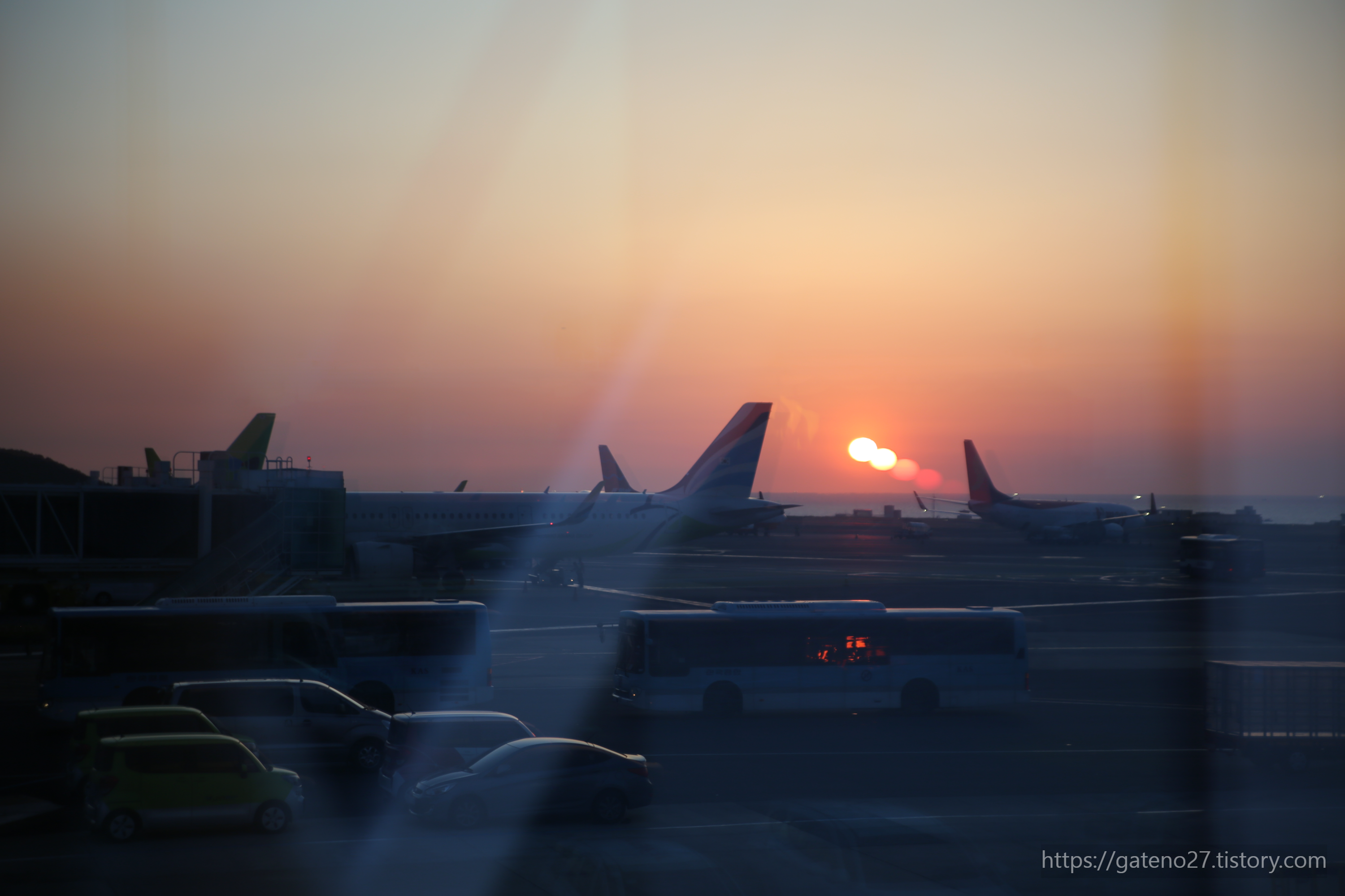 저녁 6시 출발 비행기였으니 지금 시각은 저녁 7시쯤. 창 밖으로 빨갛게 노을이 지고 있다. 얼른 짐 찾고, 렌터카 타고 숙소로 가고 싶은 마음이다.