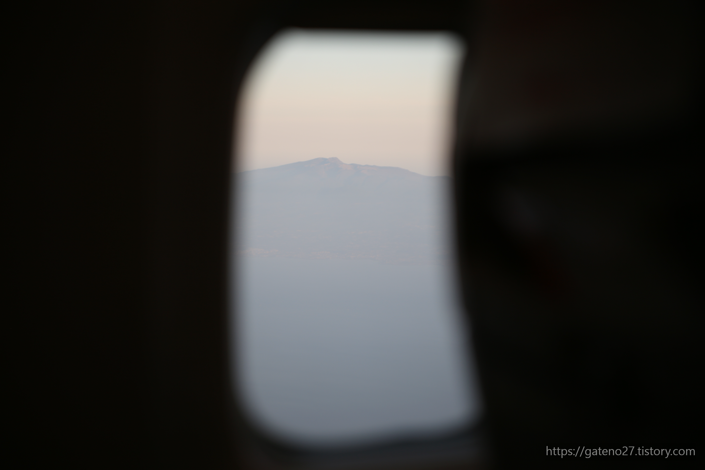 짧은 구간인 만큼, 비행기 창문 밖으로 어느덧 제주도가 보이기 시작했다. 구름이 많이 끼지 않은 맑은 날이라 그런지 저 멀리 한라산 정상이 또렷하게 보인다.