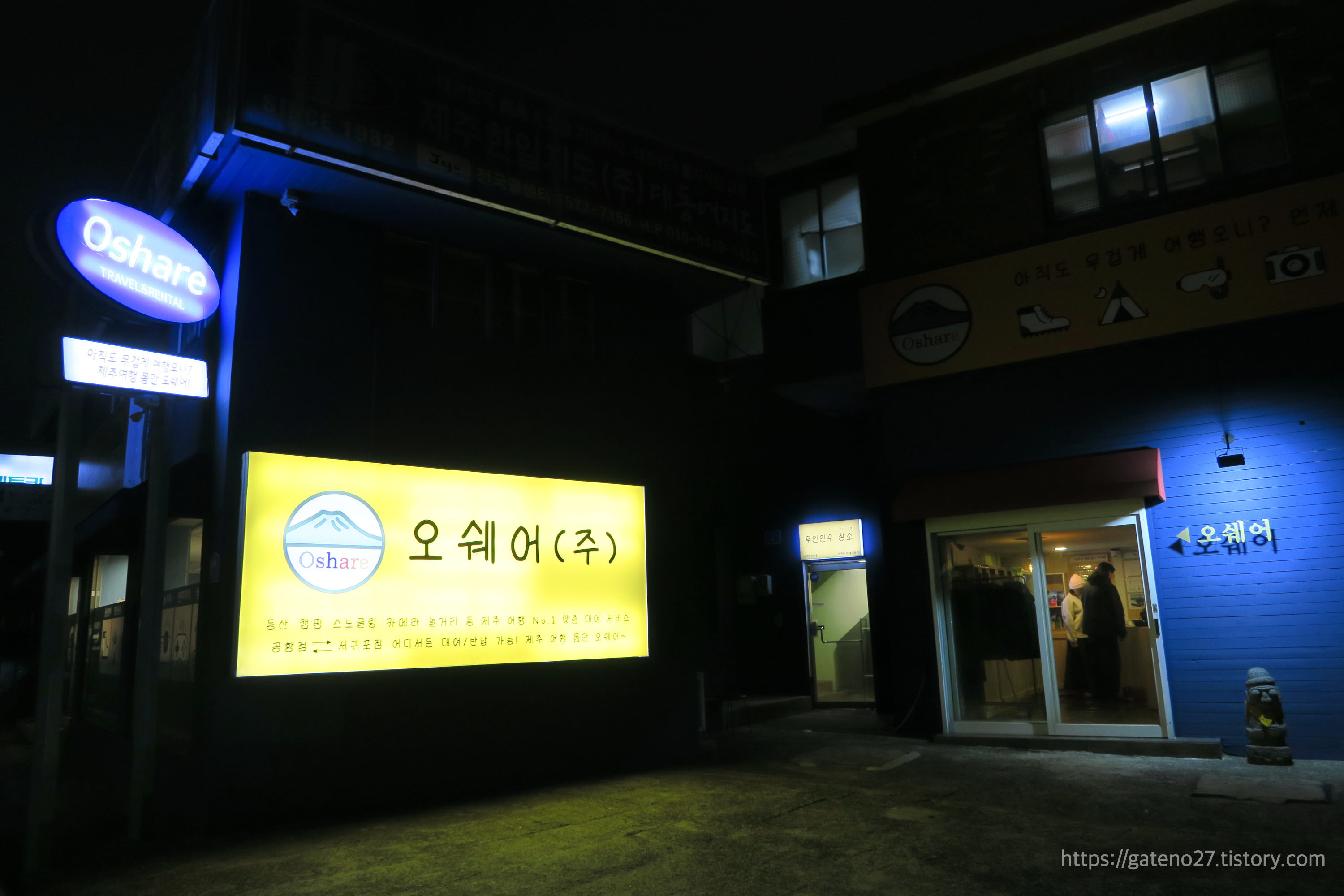 제주국제공항 도착층 1번 출구에서 일단 길을 건넌 후, 왼쪽으로 쭉 걸어가서 횡단보도를 건너면 된다. 노란색으로 적힌 오쉐어 간판이 있으니 찾는 게 어렵진 않다.