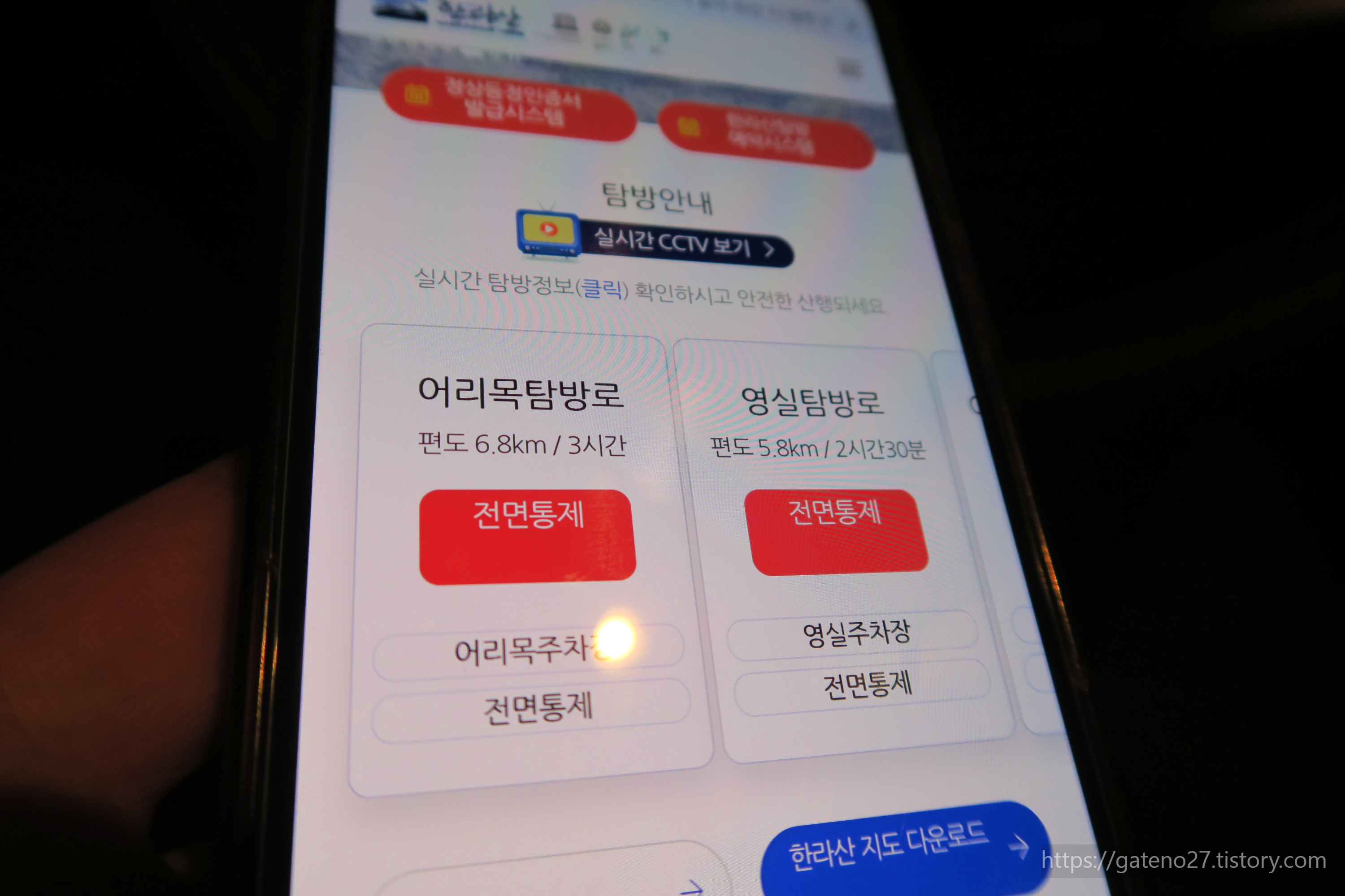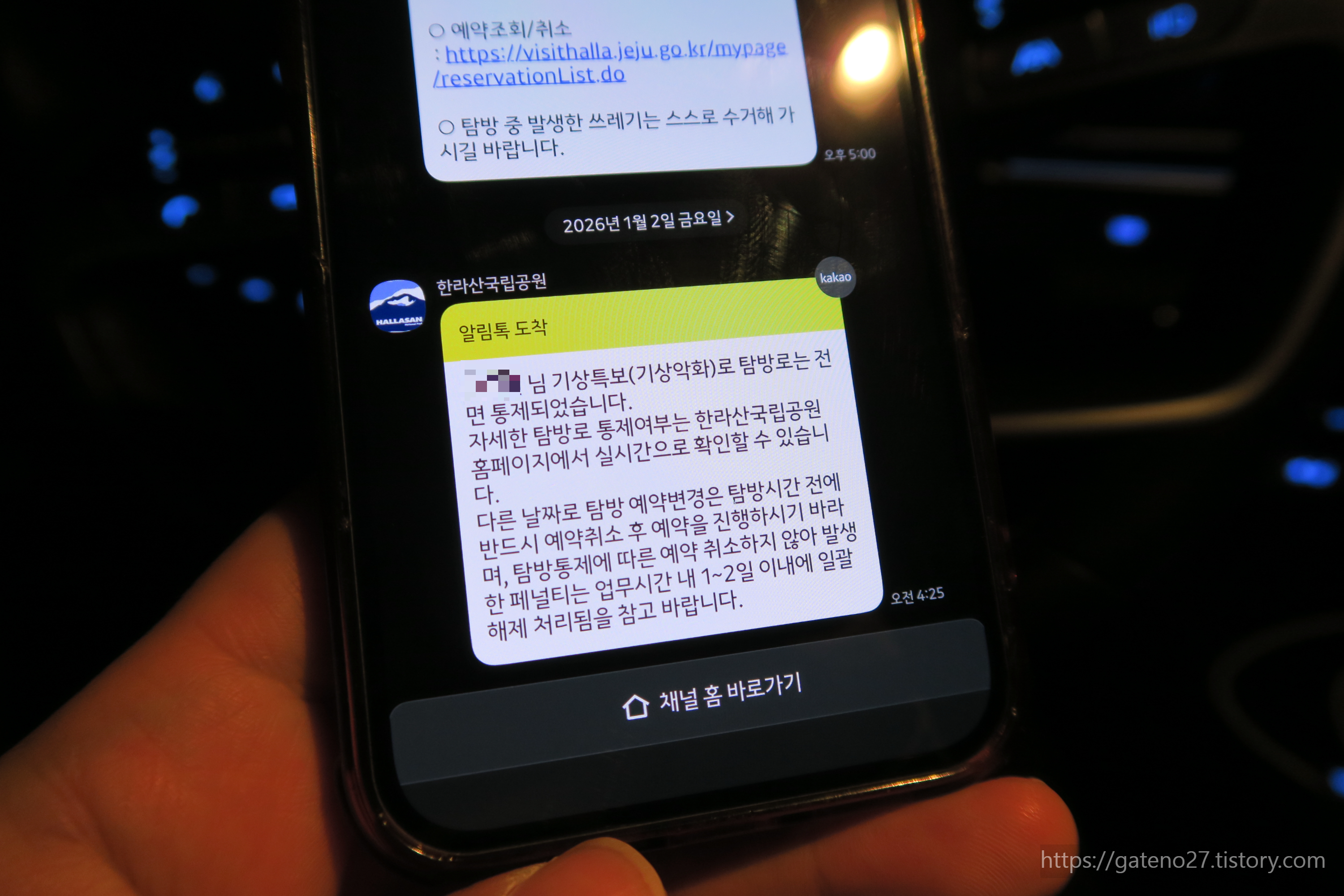 그리고 25분 뒤, 운전 중에 문자를 한 통 받았다. 대설로 인한 전면통제. 한라산 모든 등반 코스에 빨간색으로 전면통제 불빛이 들어와 있다.