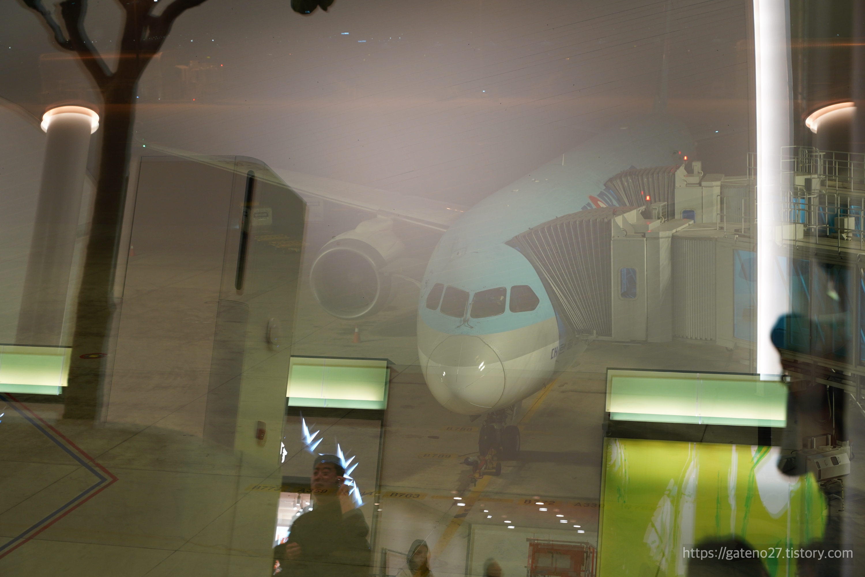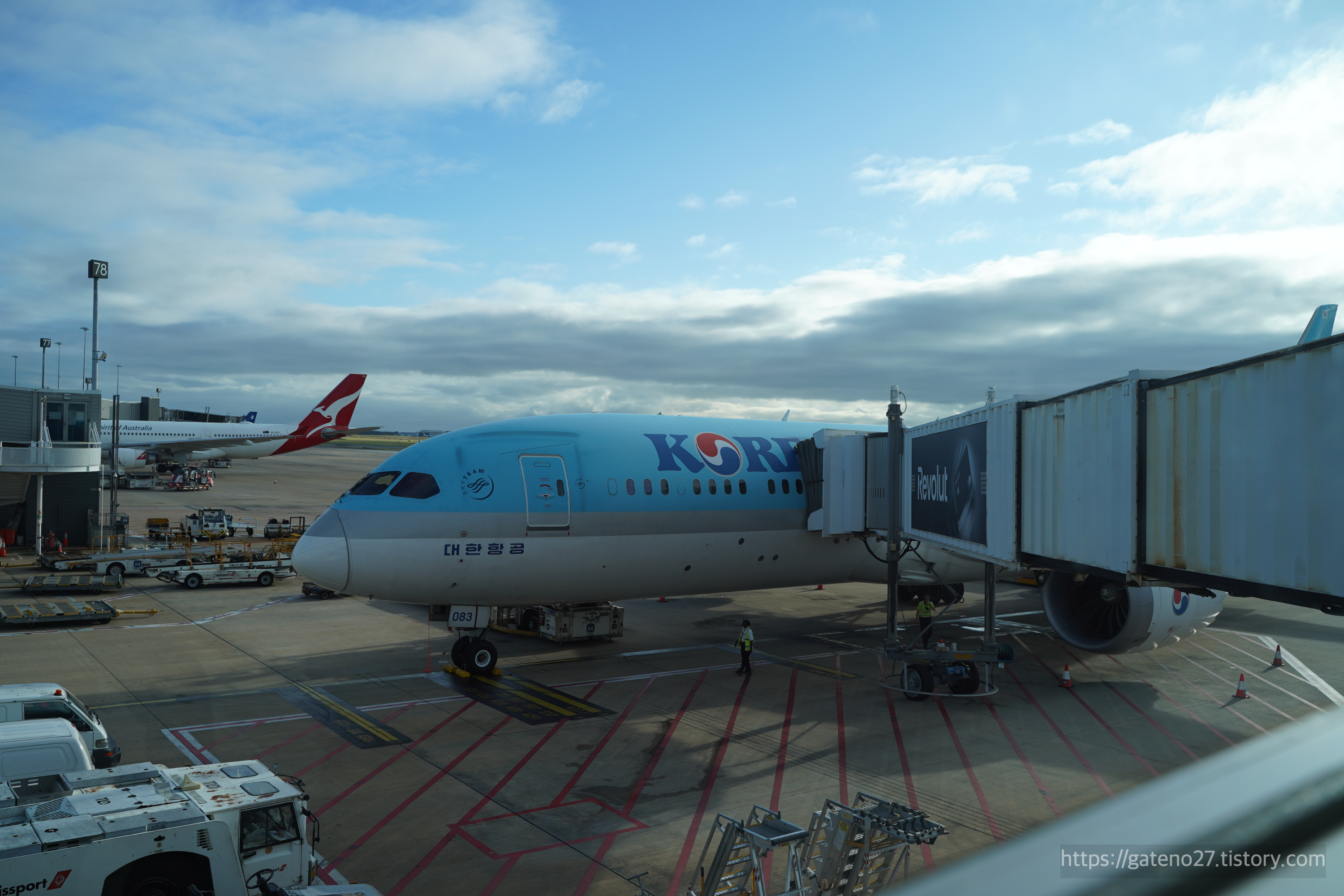 어느덧 탑승 시각이 되었다. 주기되어 있는 항공기를 안에서 슬쩍 보니, 아직 대한항공 구도장 비행기다. 등록번호 HL8083, '드림라이너'라고 불리는 보잉 B787-9 기종.