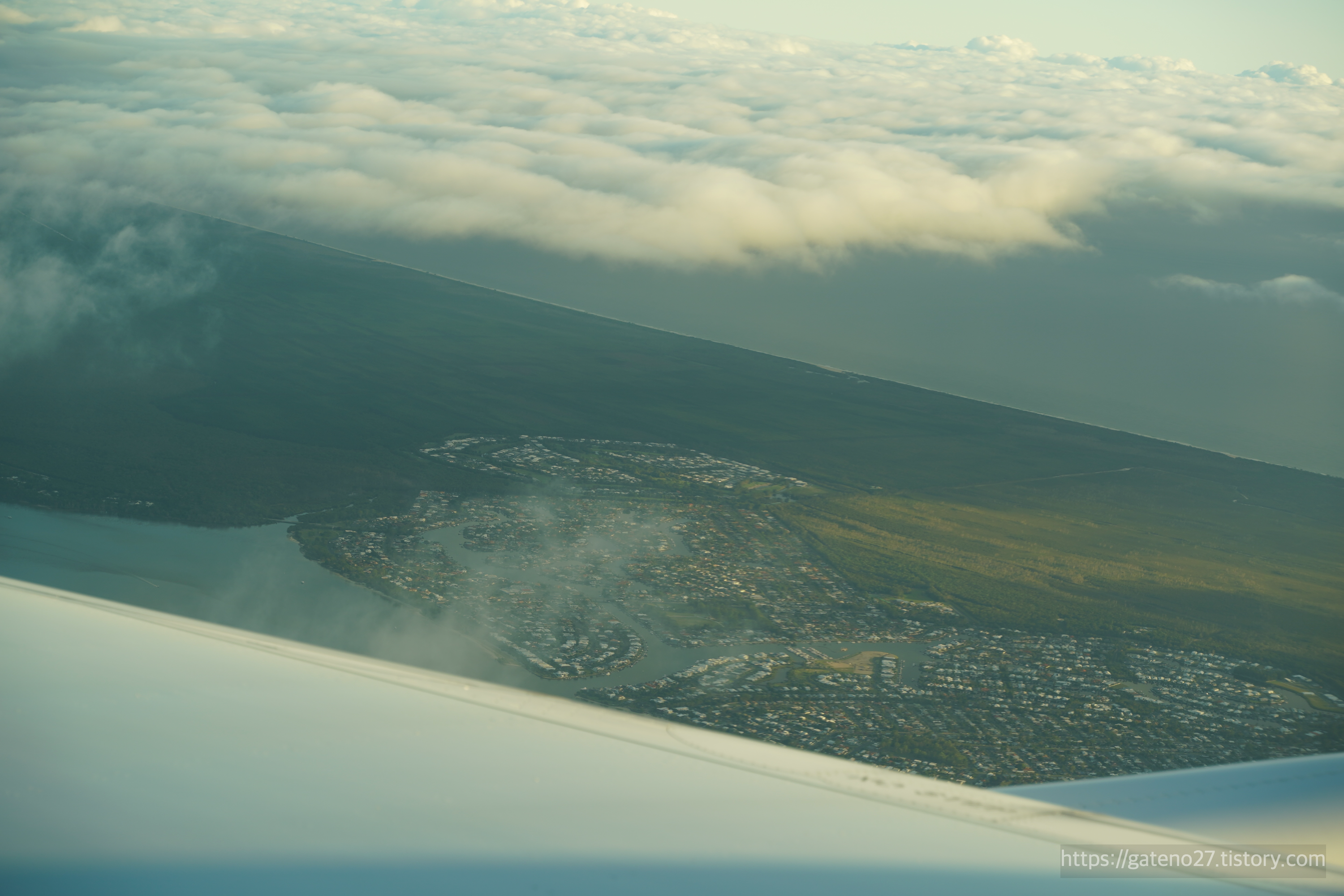 창문 농도를 적당히 조절하며 하늘 풍경을 감상하다 보니 어느덧 호주의 어느 도시 풍경이 눈에 들어오기 시작했다. 끝없는 초록 풍경의 끄트머리에 형성된 마을의 모습이 꽤나 이채롭다.
